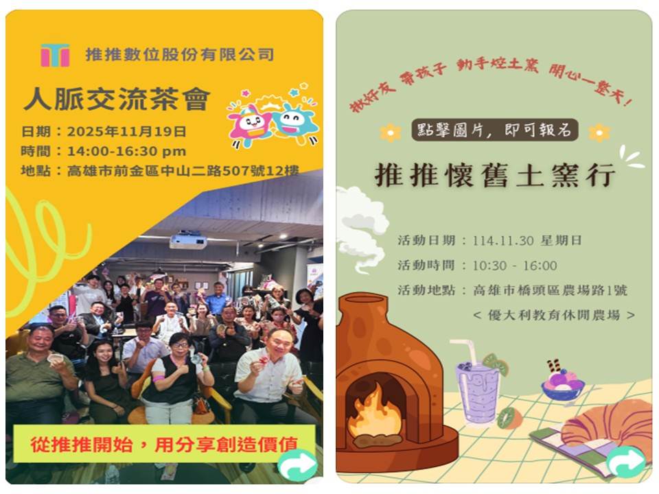 10月活動 10/15 (三) 打造專屬商務系統教學 <<前往報名>> 10/25 (六) 推推人脈交流茶會 <<前往報名>>