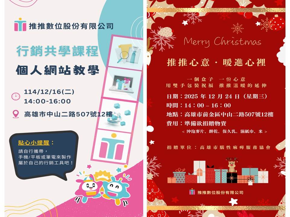 12月活動 12/16 (二) 行銷共學課程 <<前往報名>> 12/24 (三) 推推聖誕公益活動 <<前往報名>>