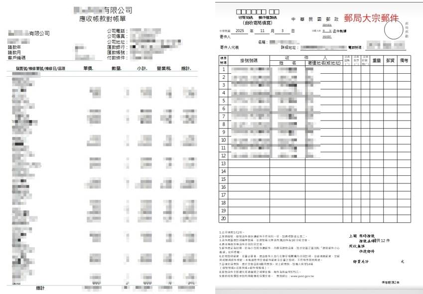手開發票列印、信封回郵、應收付明細、票據託收、銀行單據、郵務清單…等。