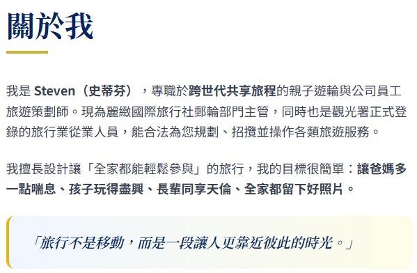 🌊 旅行,不只是移動,而是一段讓三代同堂都能微笑的回憶。 我是史蒂芬。專注高雄出發郵輪規劃,幫助家庭、企業、VIP客戶打造真正「安心、優雅、有質感」的海上假期。