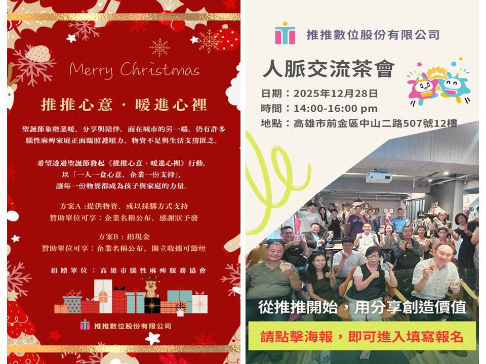 12月活動 12/24 (三)推推聖誕公益活動 <<前往報名>> 12/28 (日) 推推人脈交流茶會 <<前往報名>>