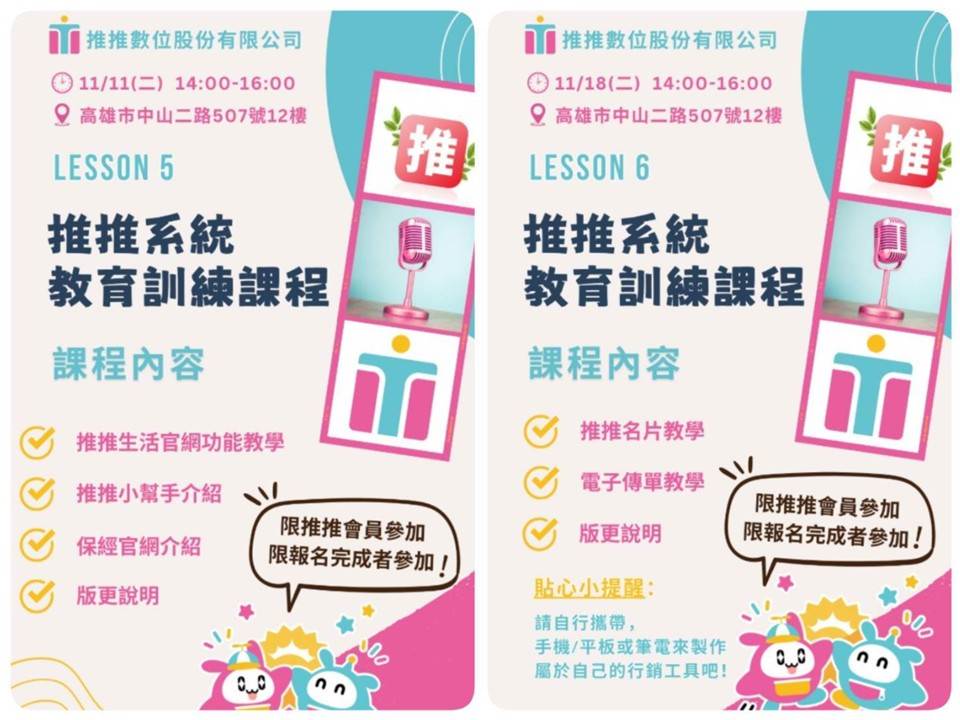 11月活動 11/11 (二) 推推系統教育訓練課程第五堂 <<前往報名>> 11/18 (二) 推推系統教育訓練課程第六堂 <<前往報名>>