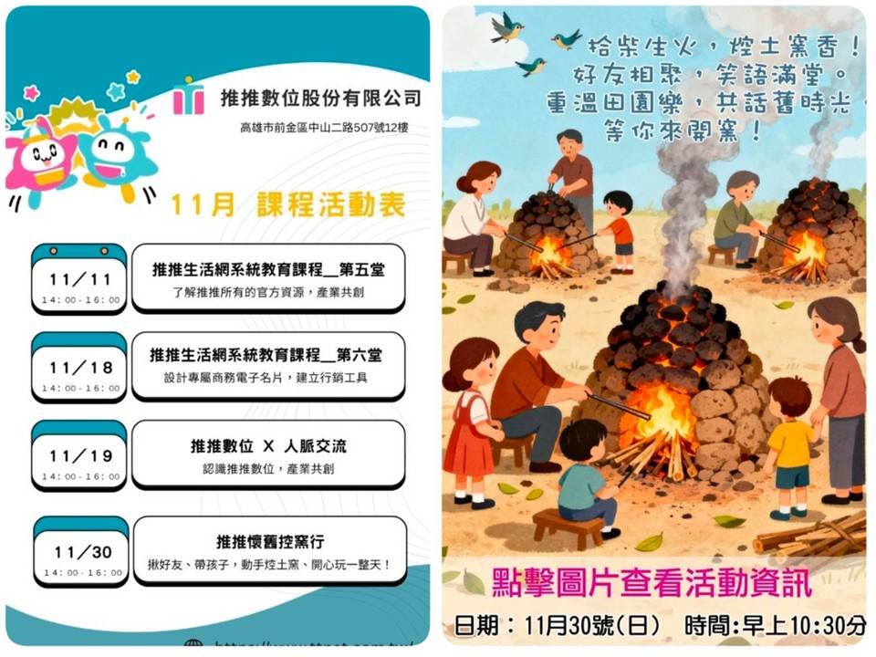 11月活動 11/25 (二) 人脈交流茶會 <<前往報名>> 11/30 (日) 推推懷舊土窰行 <<前往報名>>